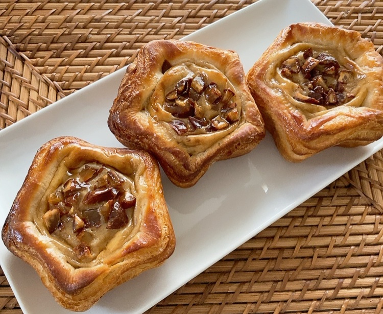 コーヒー風味でサクサクのデニッシュ生地のまん中に、カフェクリームと渋皮栗甘露煮がたっぷり入っています。星型のトレーに入れて可愛く焼き上げます。