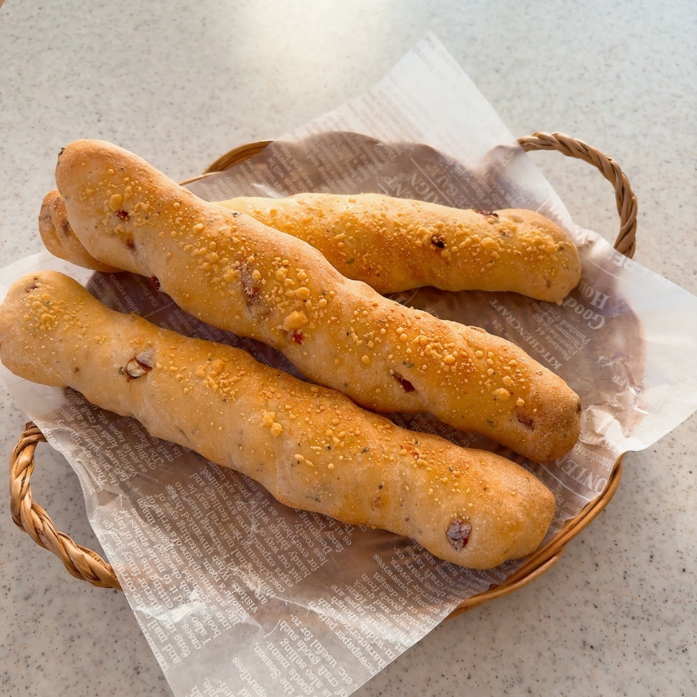濃縮された味のドライトマト入りの生地の中にチーズを入れて、ねじって成形します。