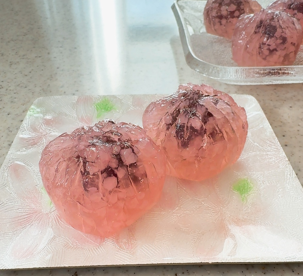 ピンク色に染めた道明寺粉が桜の花びらのような美しいお菓子です。