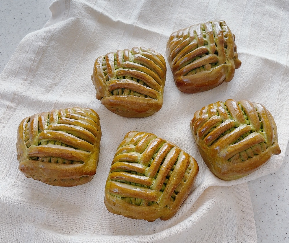 新緑の季節にぴったりな、葉っぱの形の抹茶あんぱん。抹茶風味の生地でつぶあんをたっぷり包みます。