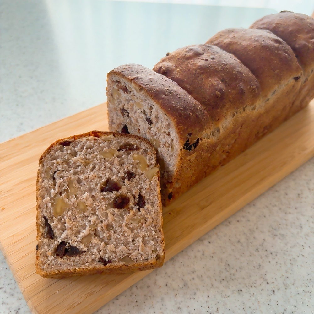 ライ麦粉を30%配合した生地にレーズンとクルミを入れた健康的な食パンです。
